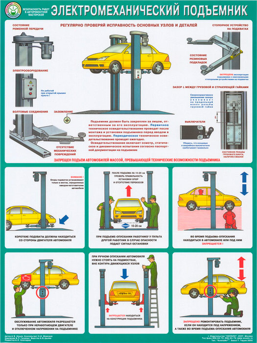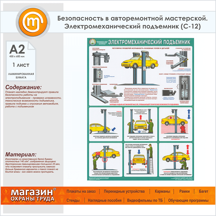 Плакат «Безопасность в авторемонтной мастерской. Электромеханический подъемник» (С-12, ламинированная бумага, А2, 1 лист) в Тюмени купить