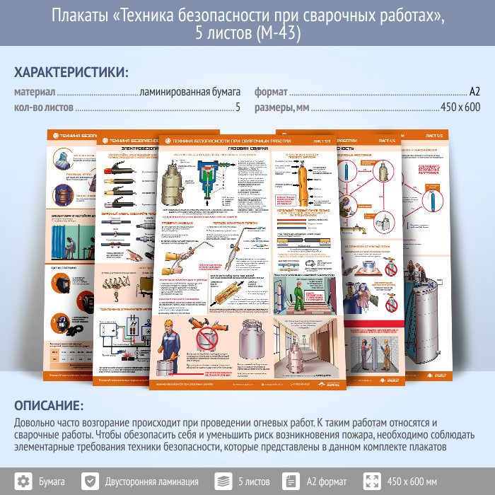 Плакаты «Техника безопасности при сварочных работах» (М-43, ламинированная бумага, А2, 5 листов) в Тюмени купить