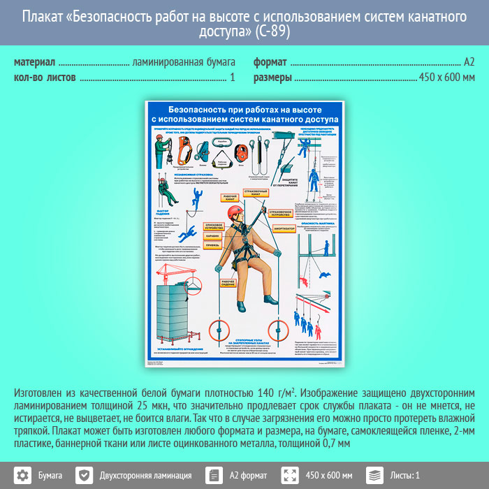 Плакат «Безопасность работ на высоте с использованием систем канатного доступа» (С-89, ламинированная бумага, А2, 1 лист) в Тюмени купить