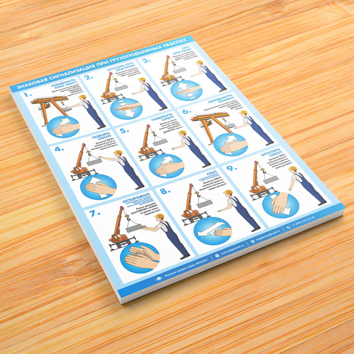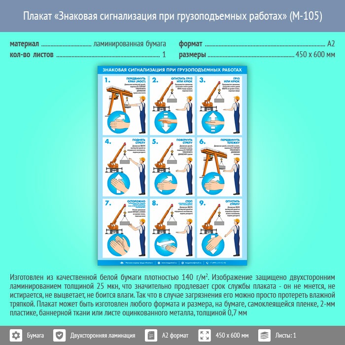 Плакат «Знаковая сигнализация при грузоподъемных работах» (М-105, ламинированная бумага, А2, 1 лист) в Тюмени купить