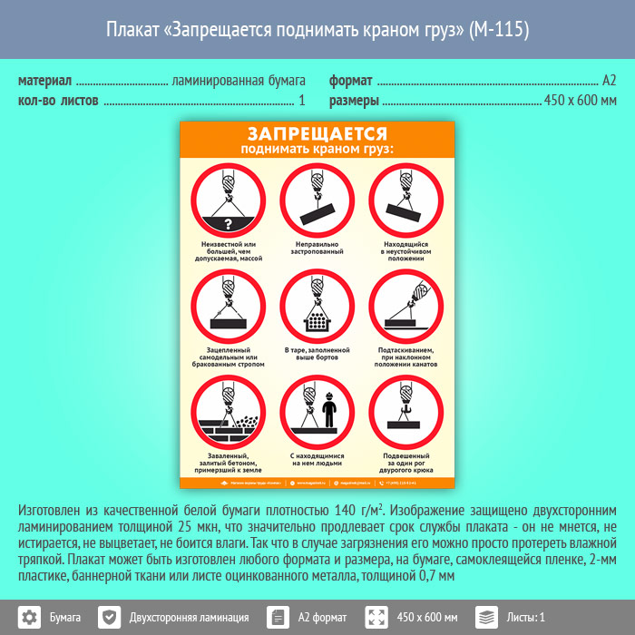 Плакат «Запрещается поднимать краном груз» (М-115, ламинированная бумага, А2, 1 лист) в Тюмени купить