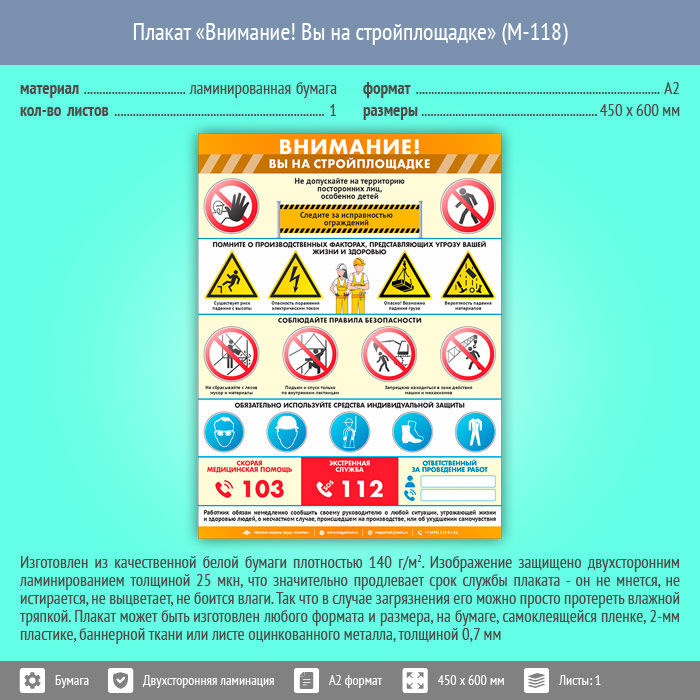 Плакат «Внимание! Вы на стройплощадке» (М-118, ламинированная бумага, А2, 1 лист) в Тюмени купить