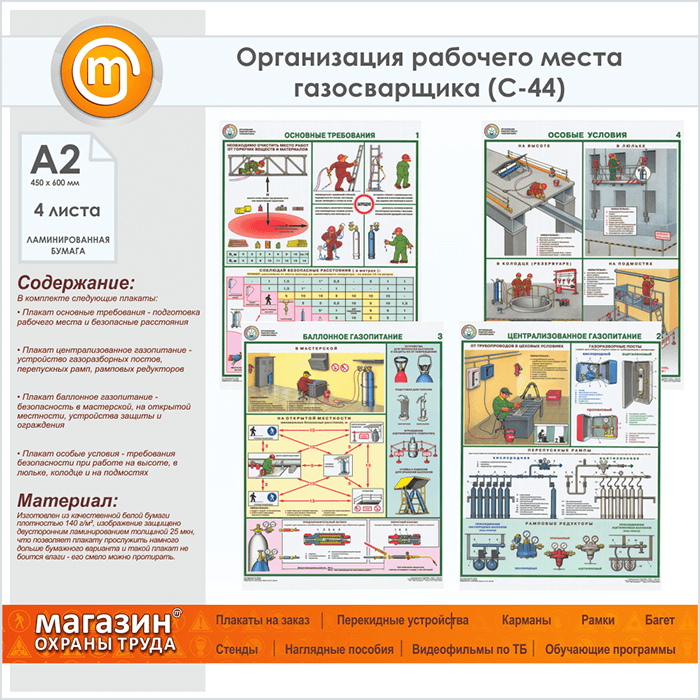 Плакаты «Организация рабочего места газосварщика» (С-44, ламинированная бумага, А2, 4 листа) в Тюмени купить