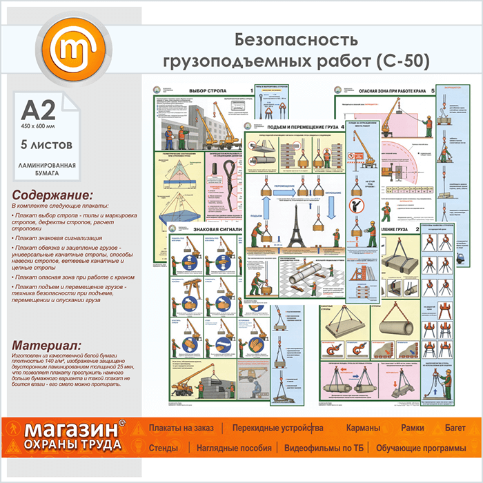 Плакаты «Безопасность грузоподъемных работ» (С-50, ламинированная бумага, А2, 5 листов) в Тюмени купить