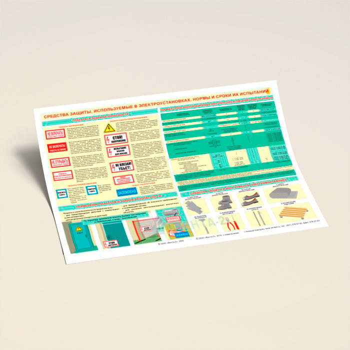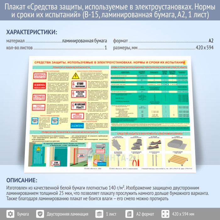 Плакат «Средства защиты, используемые в электроустановках. Нормы и сроки их испытаний» (В-15, ламинированная бумага, А2, 1 лист) в Тюмени купить