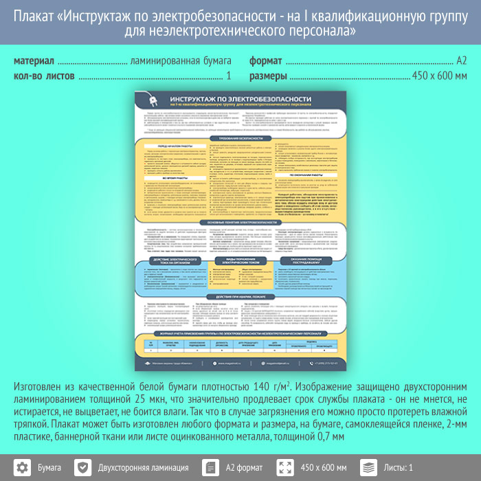 Плакат «Инструктаж по электробезопасности - на I квалификационную группу для неэлектротехнического персонала» (М-71, ламинированная бумага, А2, 1 лист) в Тюмени купить