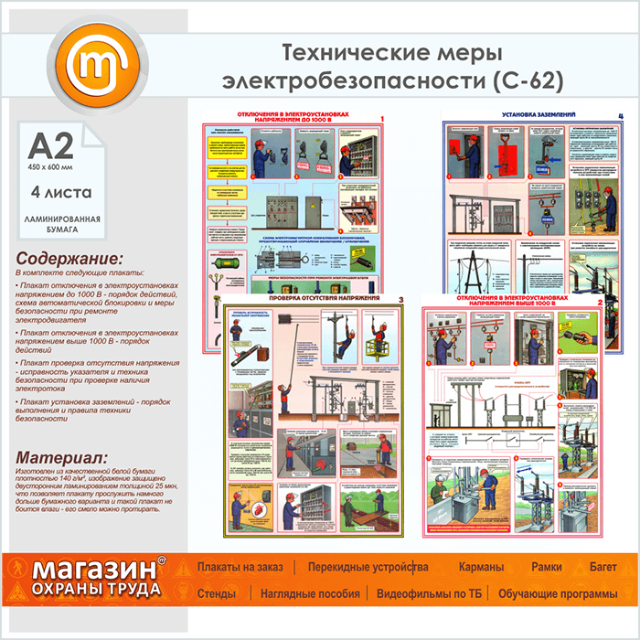 Плакаты «Технические меры электробезопасности» (С-62, ламинированная бумага, А2, 4 листа) в Тюмени купить