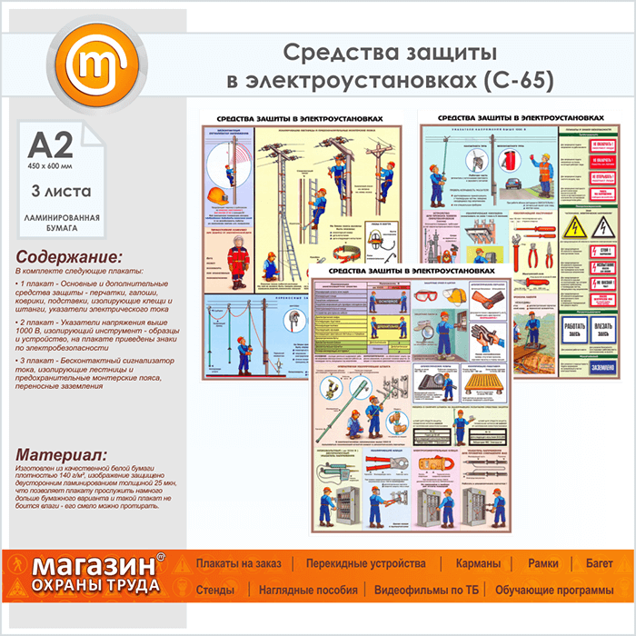 Плакаты «Средства защиты в электроустановках» (С-65, ламинированная бумага, А2, 3 листа) в Тюмени купить