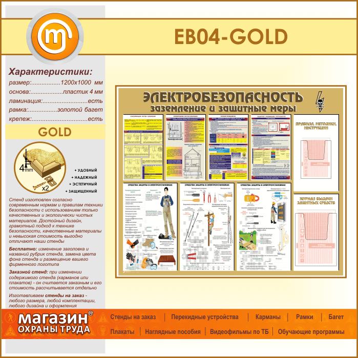 Стенд «Электробезопасность. Заземление и защитные меры» с 2 объемными карманами (EB-04-GOLD) в Тюмени купить