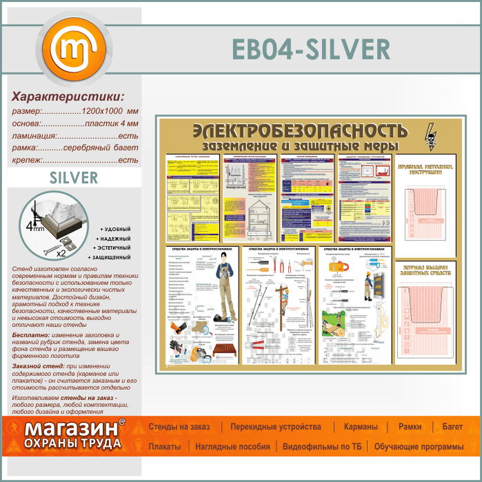 Стенд «Электробезопасность. Заземление и защитные меры» с 2 объемными карманами (EB-04-SILVER) в Тюмени купить
