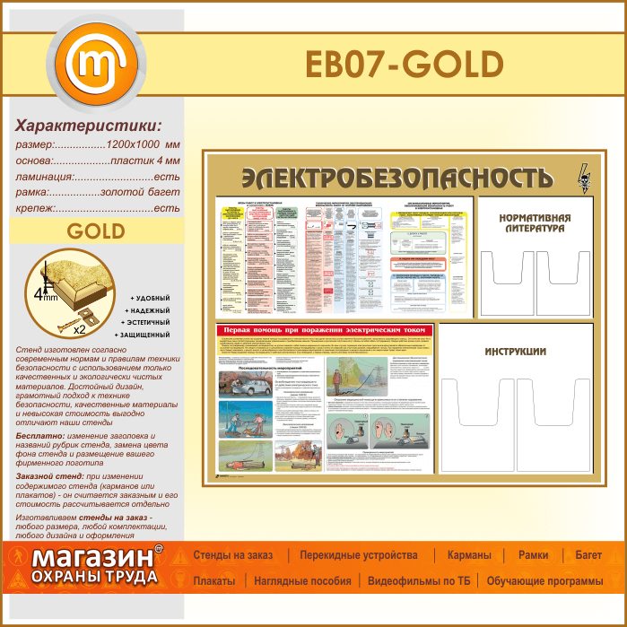 Стенд «Электробезопасность» с 4 объемными карманами (EB-07-GOLD) в Тюмени купить