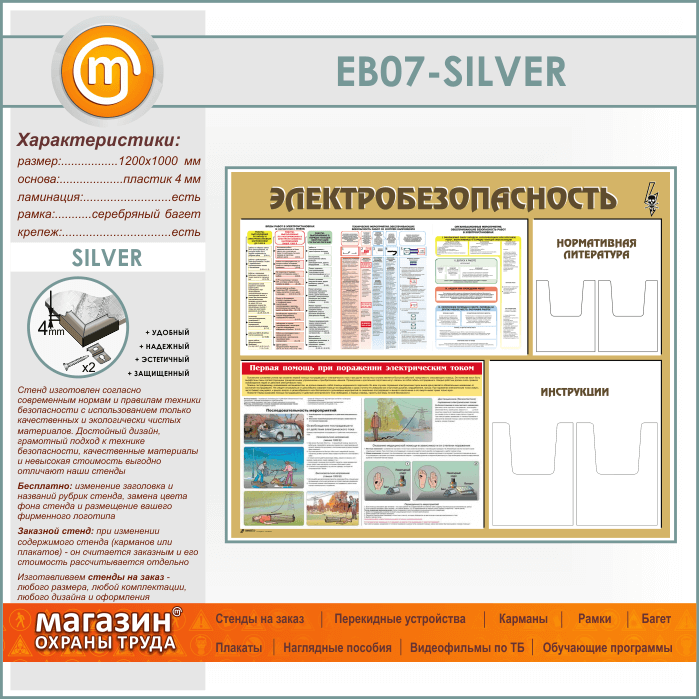 Стенд «Электробезопасность» с 4 объемными карманами (EB-07-SILVER) в Тюмени купить