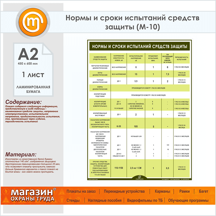 Плакат «Нормы и сроки испытаний средств защиты» (М-10, ламинированная бумага, А2, 1 лист) в Тюмени купить