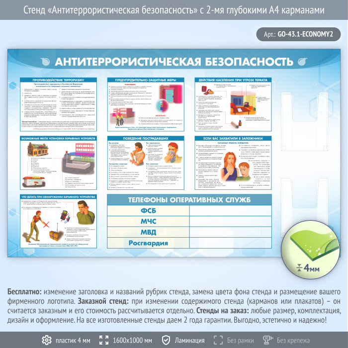Стенд «Антитеррористическая безопасность» с 2-мя глубокими А4 карманами (GO-43.1-ECONOMY2) в Тюмени купить