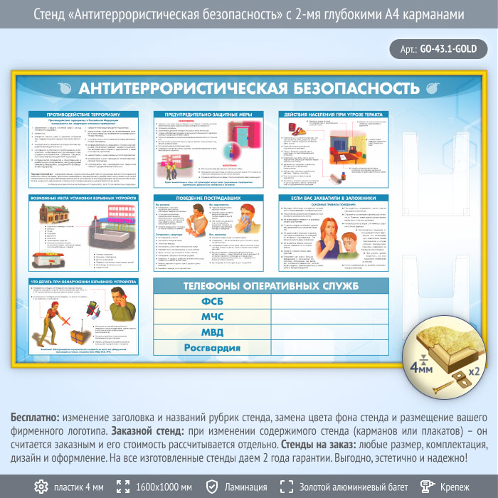 Стенд «Антитеррористическая безопасность» с 2-мя глубокими А4 карманами (GO-43.1-GOLD) в Тюмени купить