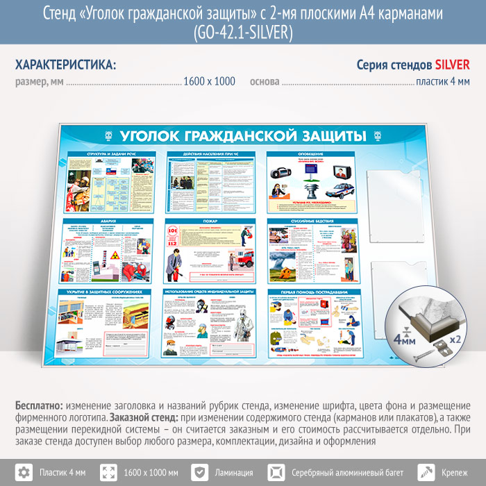 Стенд «Уголок гражданской защиты» с 2-мя плоскими А4 карманами (GO-42.1-SILVER) в Тюмени купить