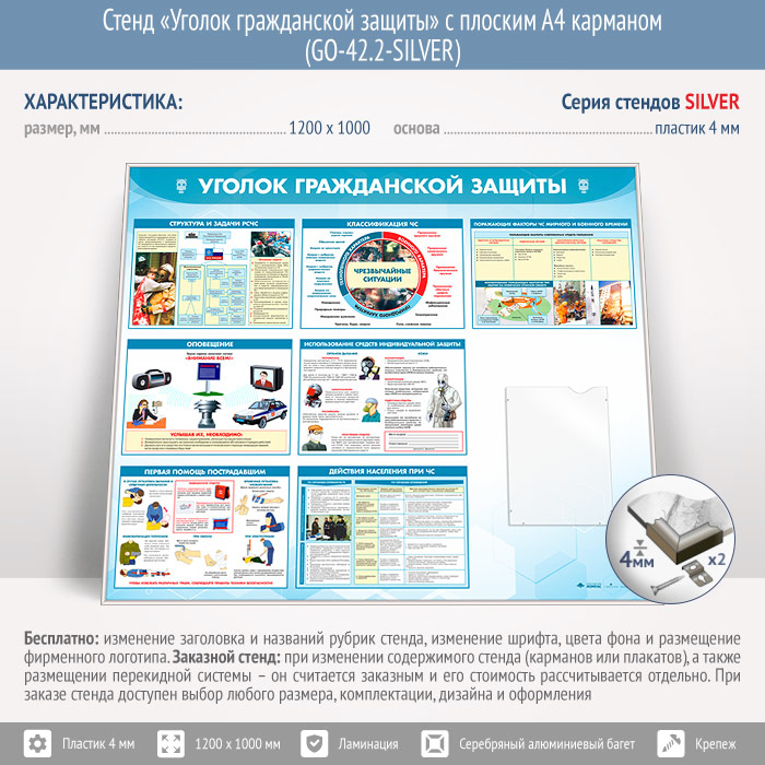 Стенд «Уголок гражданской защиты» с плоским А4 карманом (GO-42.2-SILVER) в Тюмени купить