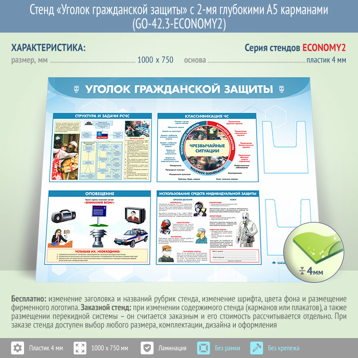 Стенд «Уголок гражданской защиты» с 2-мя глубокими А5 карманами (GO-42.3-ECONOMY2) в Тюмени купить