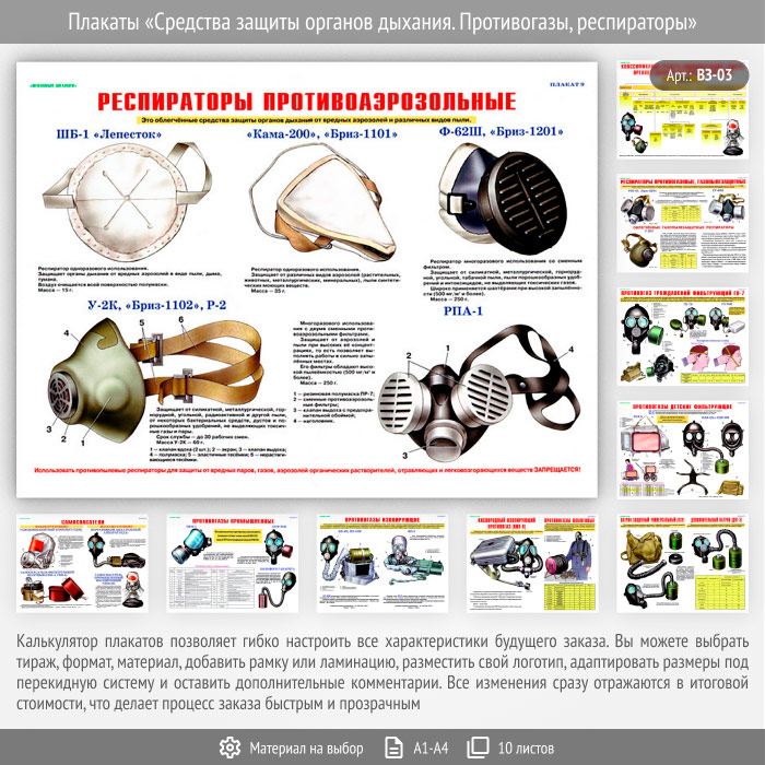 Плакаты «Средства защиты органов дыхания. Противогазы, респираторы» (ВЗ-03, 10 листов) в Тюмени купить