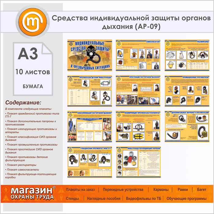 Плакаты «Средства индивидуальной защиты органов дыхания» (АР-09, бумага, А3, 10 листов) в Тюмени купить
