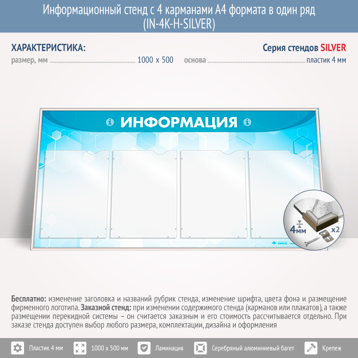Информационный стенд с 4 карманами А4 формата в один ряд (IN-4K-H-SILVER) в Тюмени купить