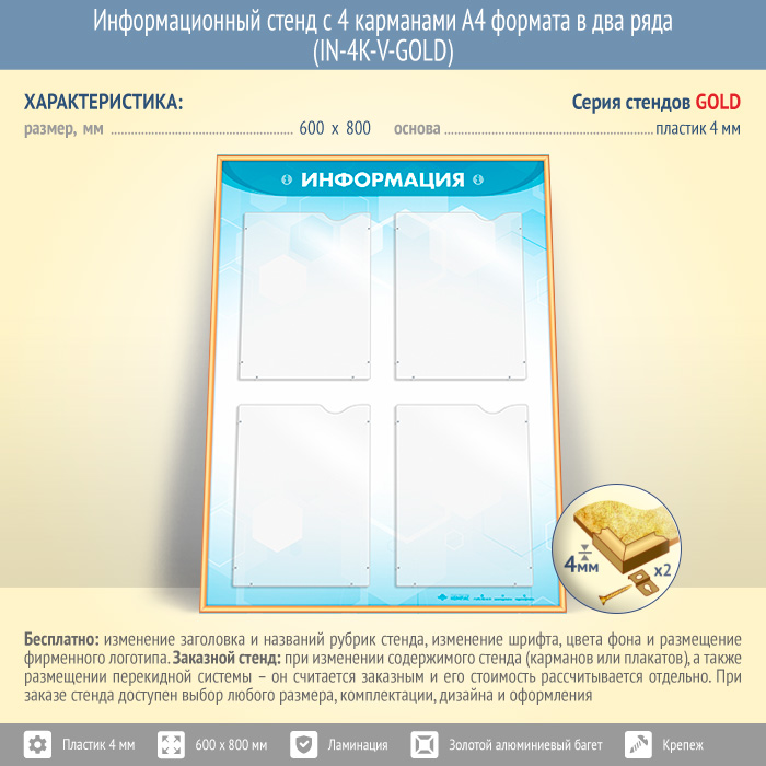 Информационный стенд с 4 карманами А4 формата в два ряда (IN-4K-V-GOLD) в Тюмени купить