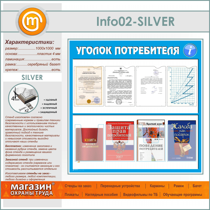 Стенд «Уголок потребителя» с 4 плоскими и 4 объемными карманами А4 формата (IN-02-SILVER) в Тюмени купить