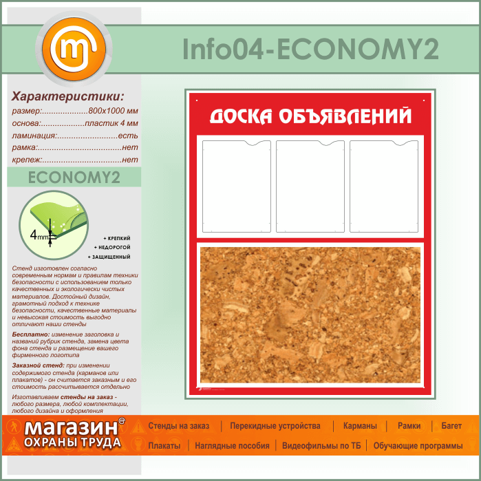 Стенд «Доска объявлений» с пробковым полотном и 3 карманами А4 формата (IN-04-ECONOMY2) в Тюмени купить