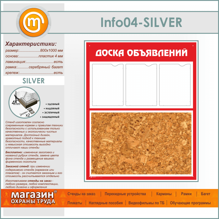 Стенд «Доска объявлений» с пробковым полотном и 3 карманами А4 формата (IN-04-SILVER) в Тюмени купить