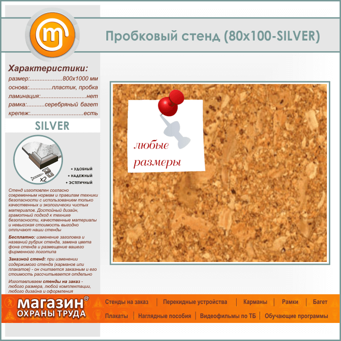 Пробковая доска, 100х80 см (IN-05-SILVER) в Тюмени купить