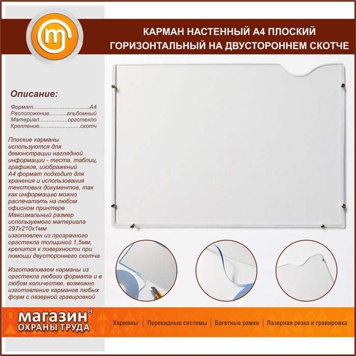 Карман настенный А4 плоский горизонтальный на двустороннем скотче в Тюмени купить