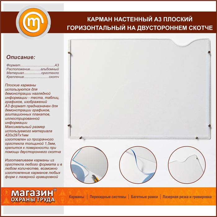 Карман настенный А3 плоский горизонтальный на двустороннем скотче в Тюмени купить