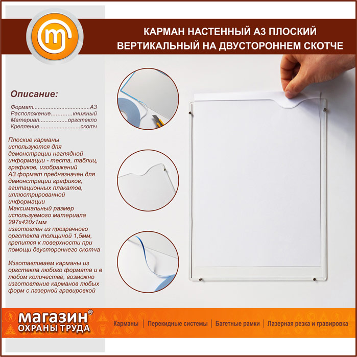 Карман настенный А3 плоский вертикальный на двустороннем скотче в Тюмени купить