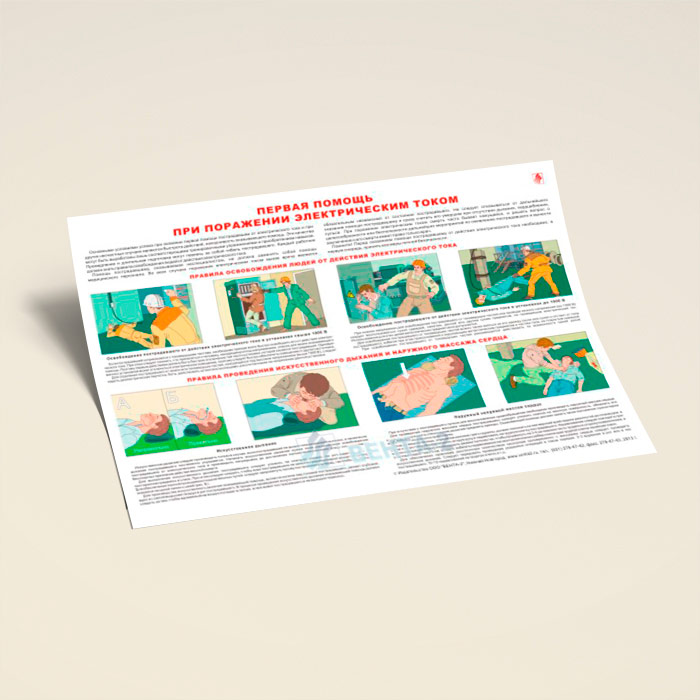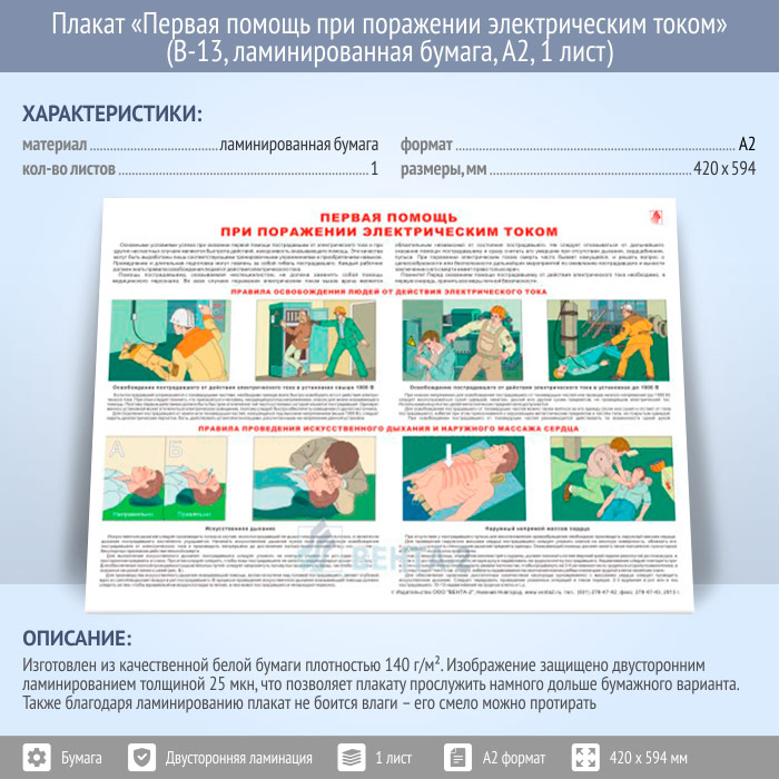 Плакат «Первая помощь при поражении электрическим током» (В-13, ламинированная бумага, А2, 1 лист) в Тюмени купить