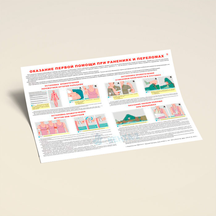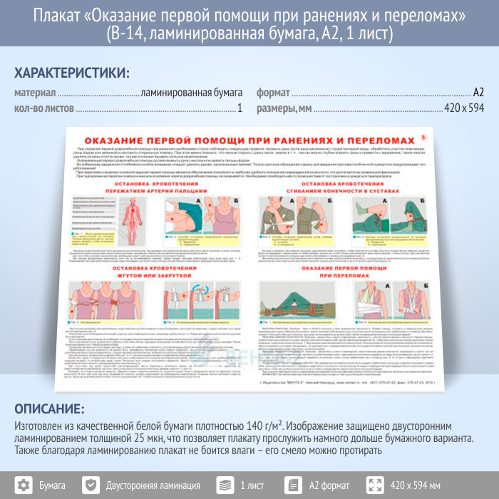 Плакат «Оказание первой помощи при ранениях и переломах» (В-14, ламинированная бумага, А2, 1 лист) в Тюмени купить