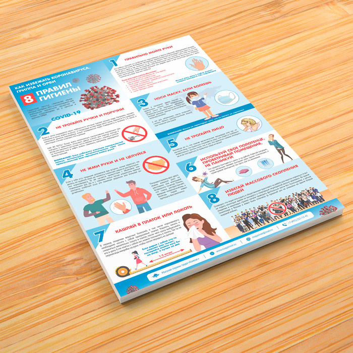 Плакат «Восемь правил гигиены. Как избежать коронавируса, гриппа и ОРВИ» (М-28, ламинированная бумага, А3, 1 лист) в Тюмени купить