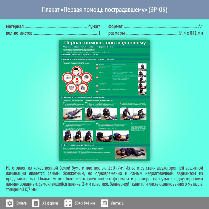 Плакат «Первая помощь пострадавшему» (ЭР-03, бумага, А1, 1 лист) в Тюмени купить