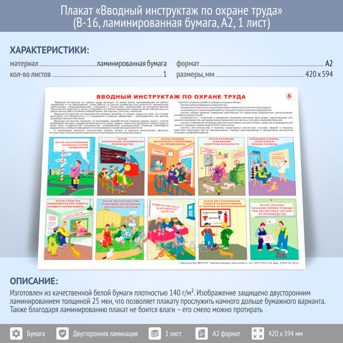 Плакат «Вводный инструктаж по охране труда» (В-16, ламинированная бумага, А2, 1 лист) в Тюмени купить