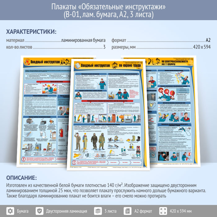 Плакаты «Обязательные инструктажи» (вводный инструктаж, вводный противопожарный инструктаж, инструктаж на I группу по электробезопасности) (В-01, ламинированная бумага, А2, 3 листа) в Тюмени купить