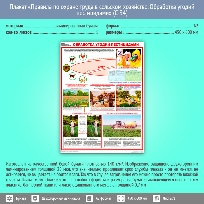 Плакат «Правила по охране труда в сельском хозяйстве. Обработка угодий пестицидами» (С-94, ламинированная бумага, А2, 1 лист) в Тюмени купить