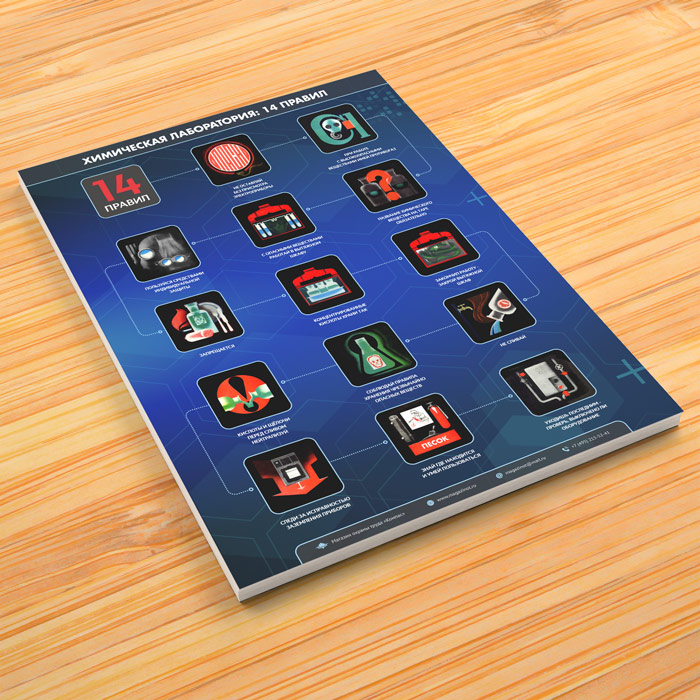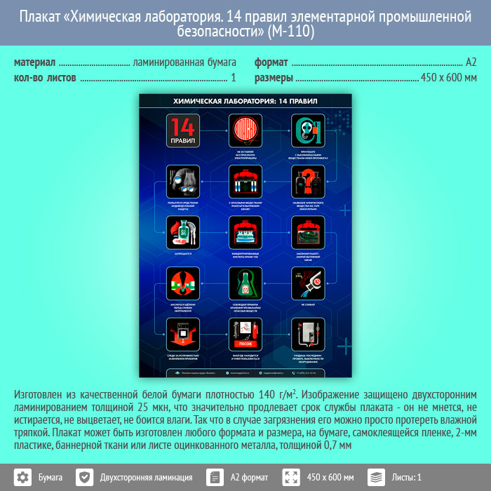 Плакат «Химическая лаборатория. 14 правил элементарной промышленной безопасности» (М-110, ламинированная бумага, А2, 1 лист) в Тюмени купить