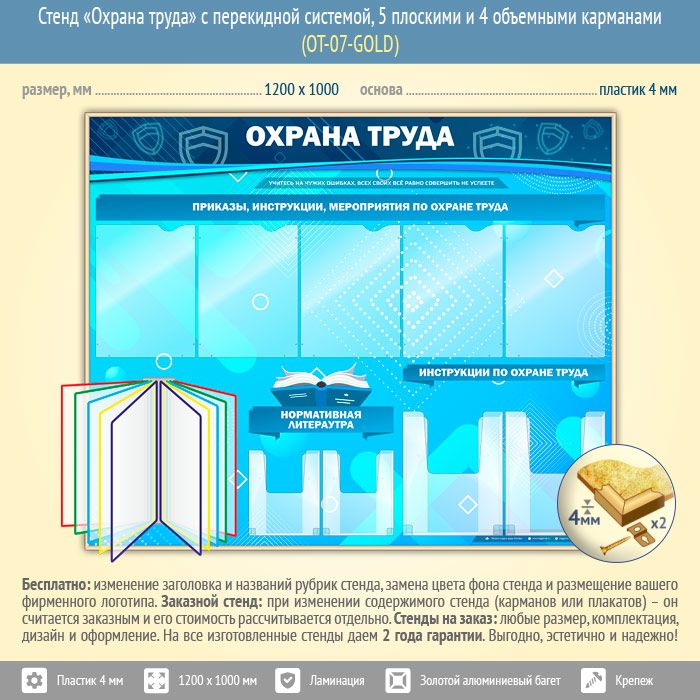 Стенд «Охрана труда» с перекидной системой, 5 плоскими и 4 объемными карманами (OT-07-GOLD) в Тюмени купить