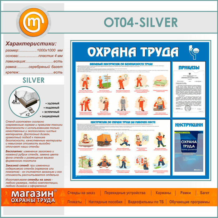 Стенд «Охрана труда» с плоским и объемным карманами (OT-04-SILVER) в Тюмени купить