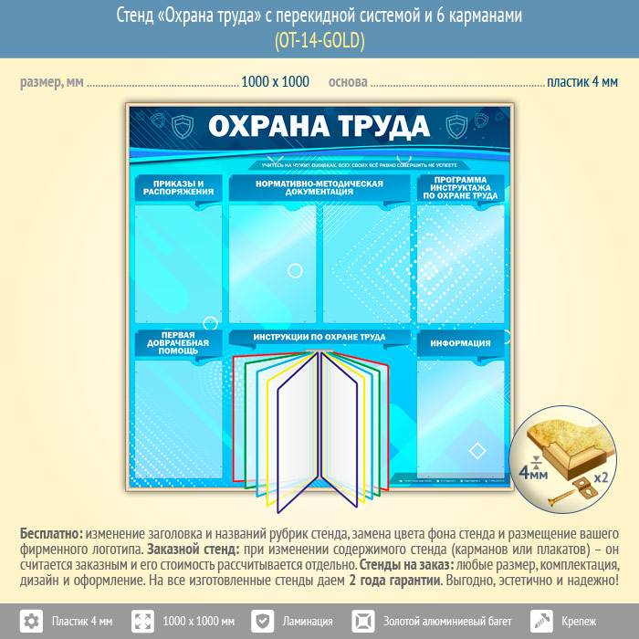 Стенд «Охрана труда» с перекидной системой и 6 карманами (OT-14-GOLD) в Тюмени купить
