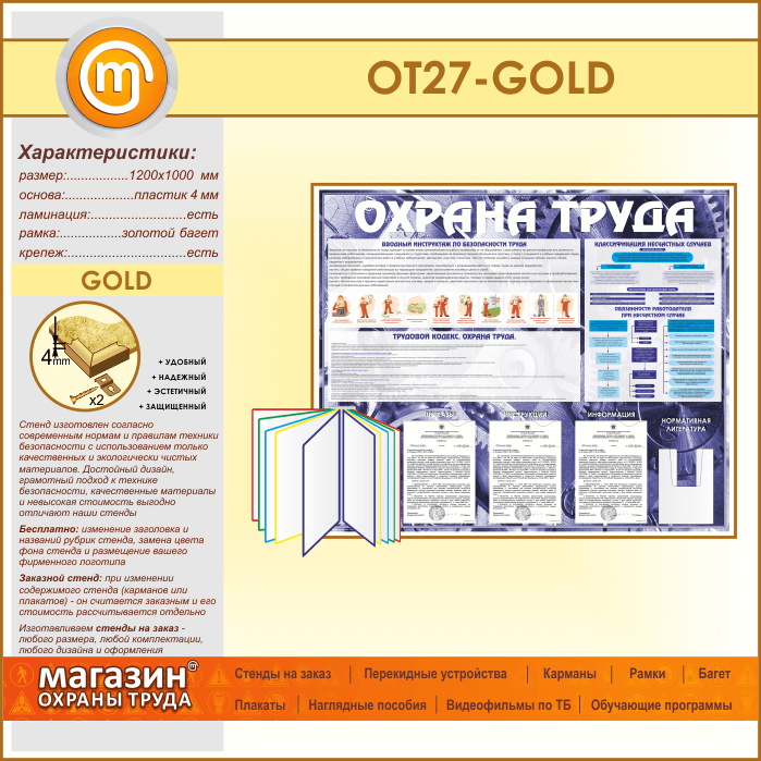 Стенд «Охрана труда» с перекидной системой, 3 плоскими и 1 объемным карманом (OT-27-GOLD) в Тюмени купить