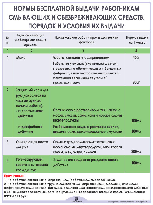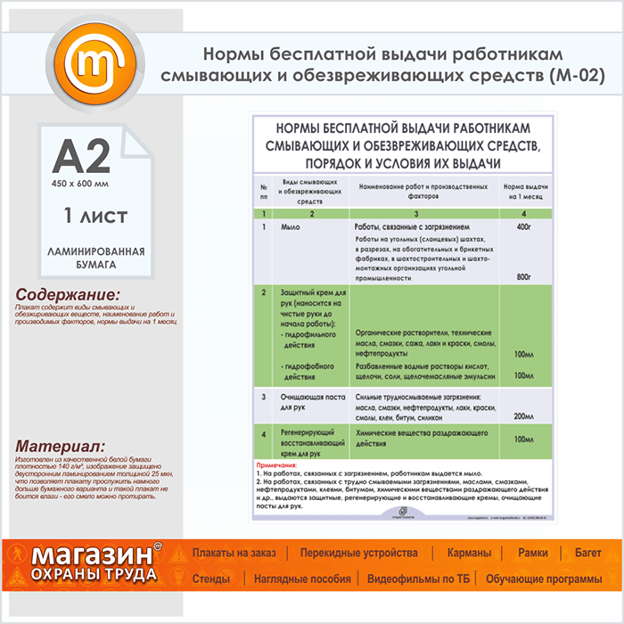 Плакат «Нормы бесплатной выдачи работникам смывающих и обезвреживающих средств» (М-02, ламинированная бумага, А2, 1 лист) в Тюмени купить
