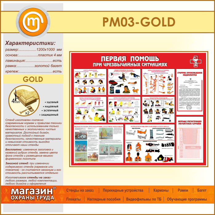 Стенд «Первая помощь при чрезвычайных ситуациях» с плоским и объемным карманами (PM-03-GOLD) в Тюмени купить