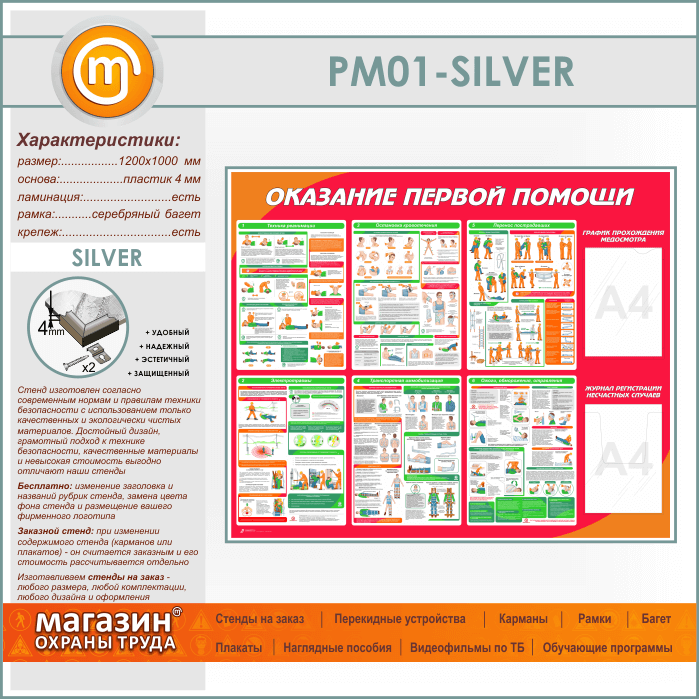 Стенд «Оказание первой помощи» с плоским и объемным карманами (PM-01-SILVER) в Тюмени купить