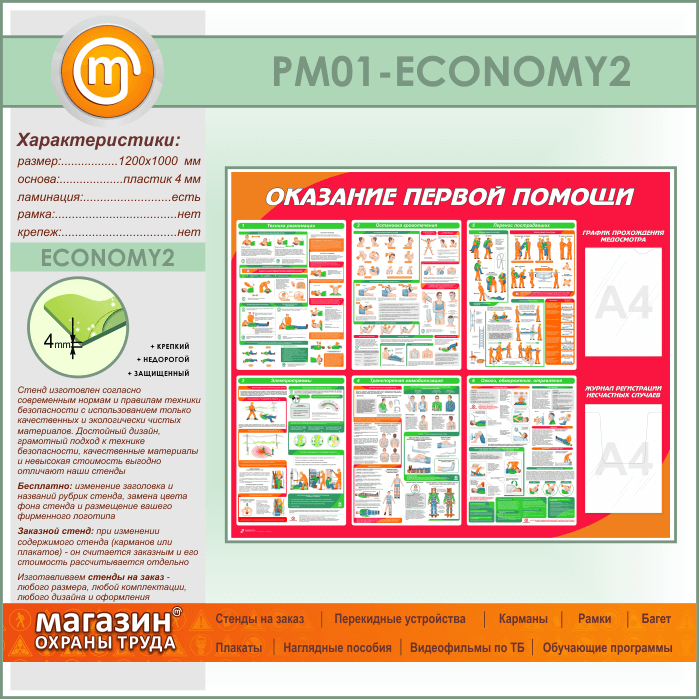 Стенд «Оказание первой помощи» с плоским и объемным карманами (PM-01-ECONOMY2) в Тюмени купить
