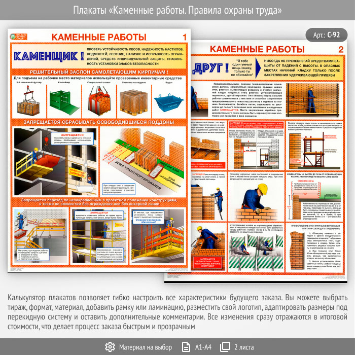 Плакаты «Каменные работы. Правила охраны труда» (С-92, 2 листа)